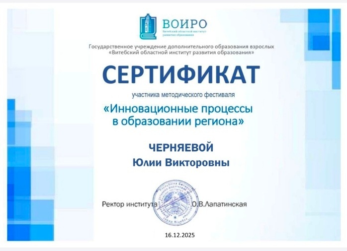 16 декабря 2025, в городе Витебск состоялся методический фестиваль «Инновационные процессы в образовании региона». На фестивале со своим докладом по реализации областного творческого проекта «Приобщение детей дошкольного возраста к систематическим занятиям спортом посредством овладения техническими, тактическими и практическими навыками игры в футбол» выступил наш руководитель физического воспитания Юлия Викторовна