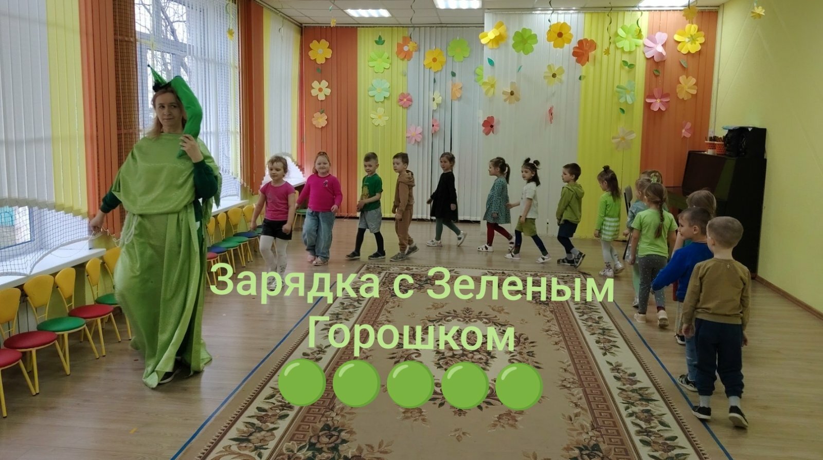 Как обычно день начался с зарядки, но в этот раз она прошла с Зелёным Горошком. Все дети активно участвовали и получили массу положительных эмоций.